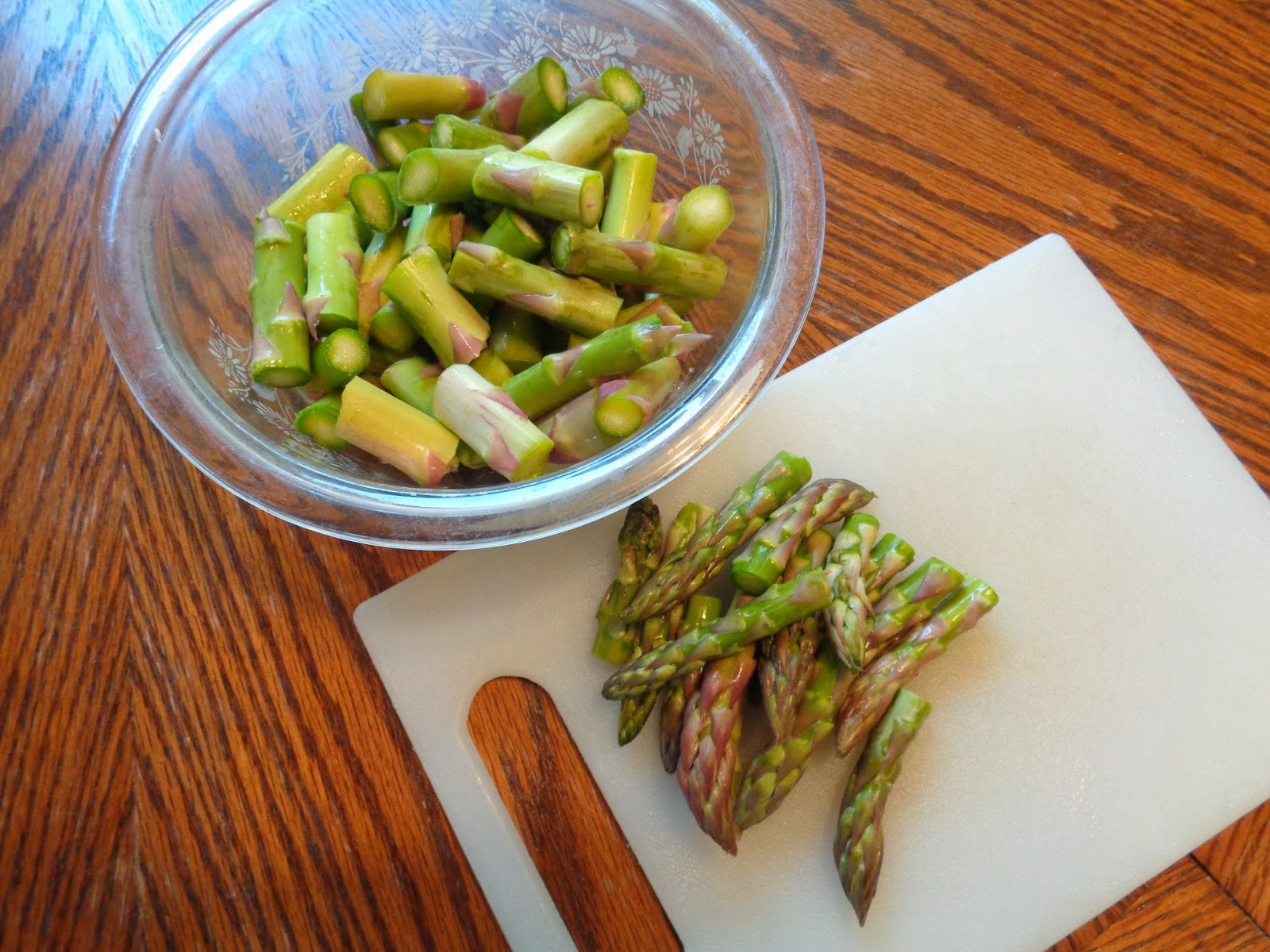 1. Rinse and dry the asparagus. Then, trim the rough ends from the bottoms discard them (cut about 1 inch off). Cut the rest of the asparagus into 1-inch pieces, setting the tips aside.