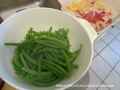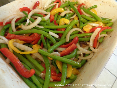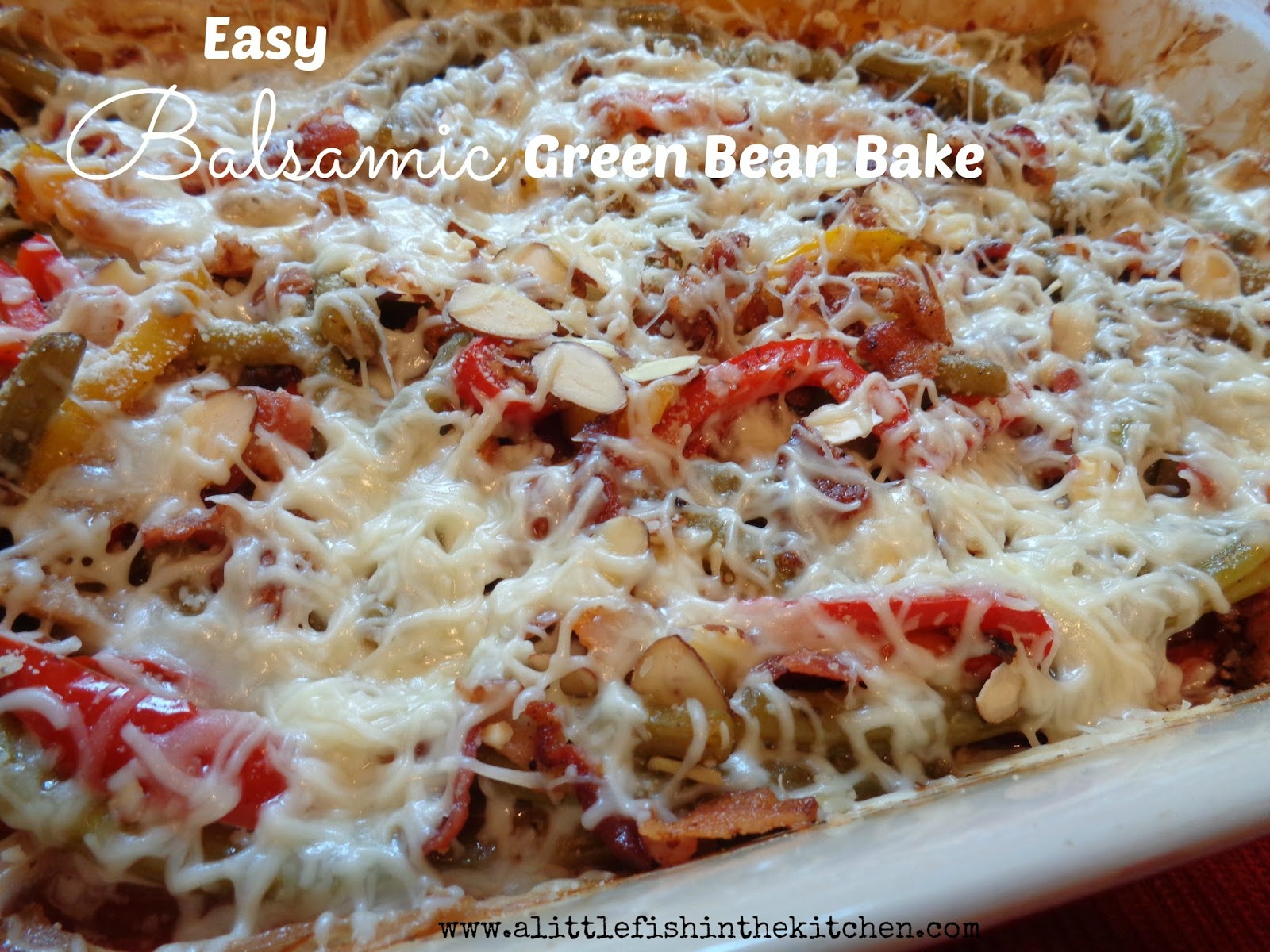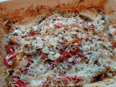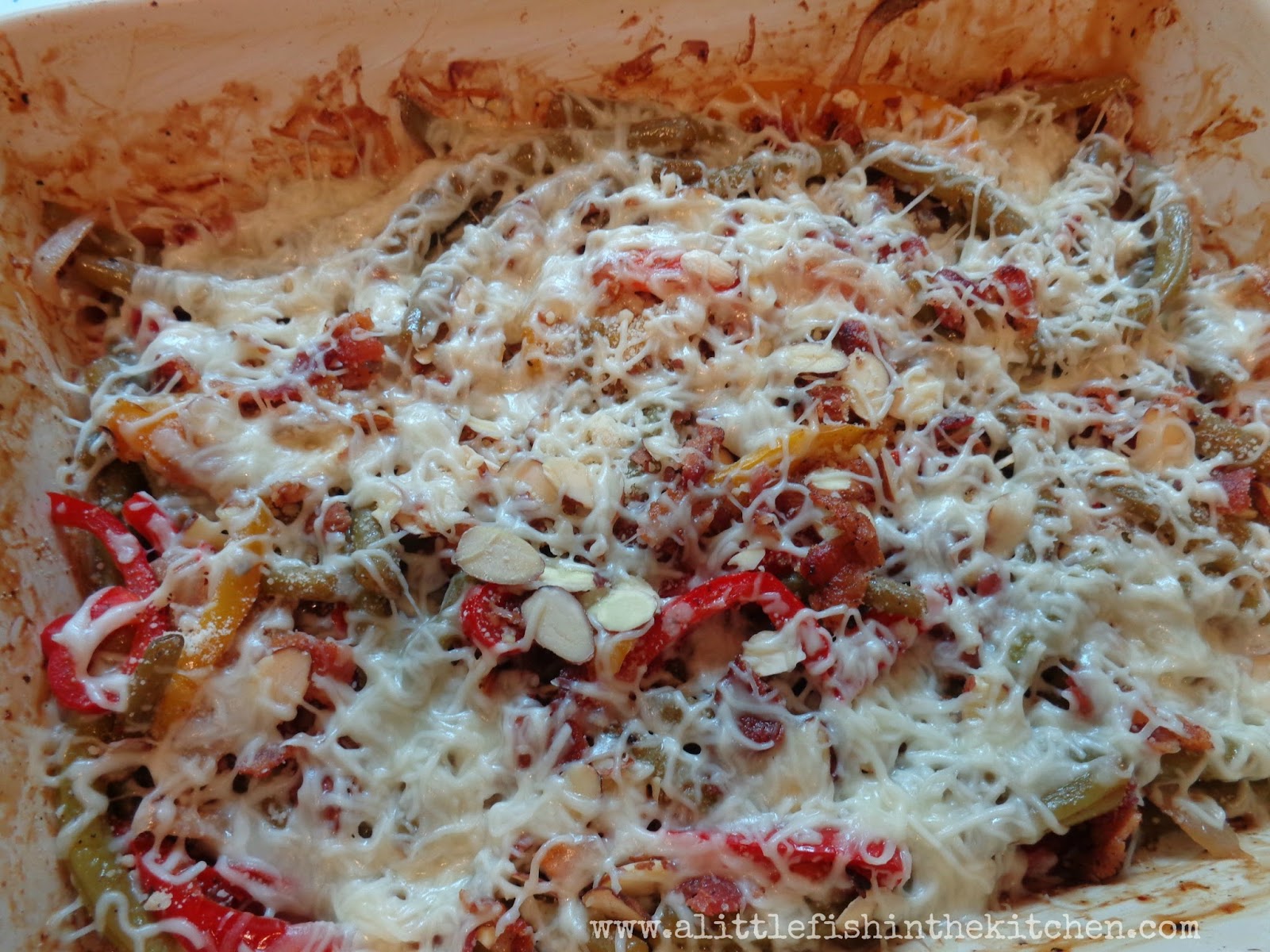 So, with this week’s pound of green beans I decided to change things up a bit. Okay, so I changed them up a lot! Instead of boiling them, I roasted them with some sweet peppers and onions in an easy honey-balsamic sauce and topped them with bacon, crunchy almonds and cheese.