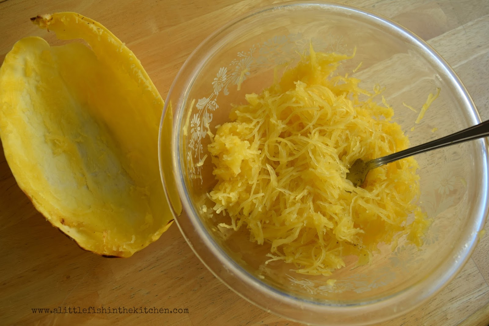- 1/2 medium-sized spaghetti squash, cooked and shredded (about 3-4 cups prepared squash)