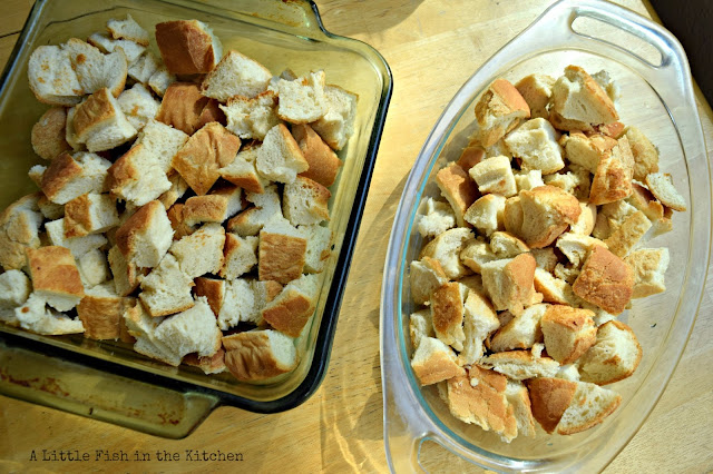 1. Place your torn bits of bread in a lightly greased, 2-quart baking dish.