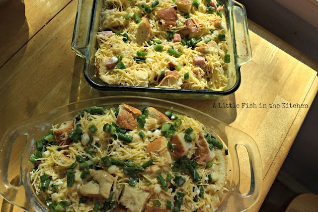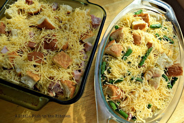 This recipe is designed to fill a 2 quart baking pan, but my kids won’t touch asparagus. They do, however, love ham and cheese. So, I split the ingredients between two smaller baking dishes and I only used asparagus on the grown-up portion.
