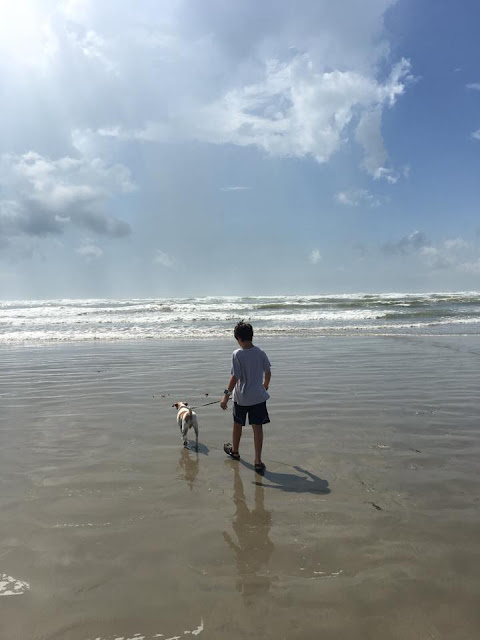 Last week, we got to sneak away for an extended visit with my family on the coast. My girl stayed with her auntie (and got good and spoiled!) while my son and I got to go explore in Port Aransas, a popular tourist town on Mustang Island, for a couple of nights. We ate some great seafood and took Rex for long relaxing walks on the beach. We also took a boat tour to watch wild, bottle-nose dolphins in the town harbor. We were lucky and saw lots of dolphins out that evening. As I understand it, they aren’t always so cooperative and it was really fun!
