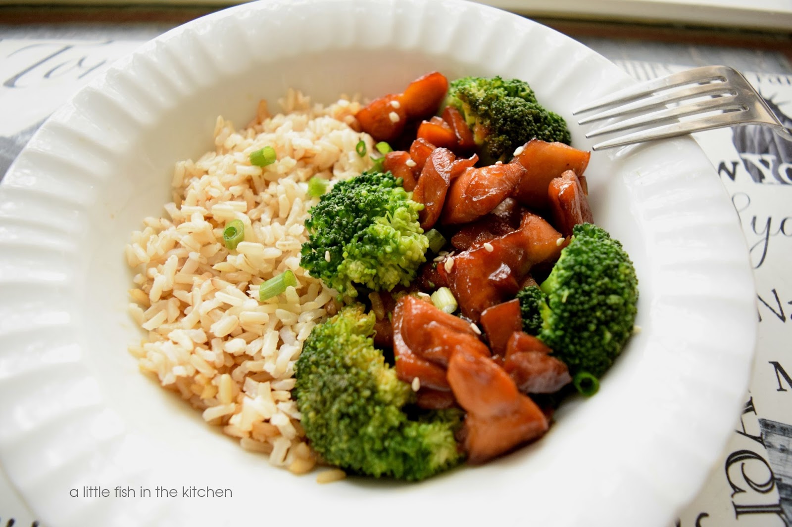 I just added some steamed brown rice and broccoli and we had a delicious and pretty meal in a bowl!