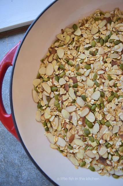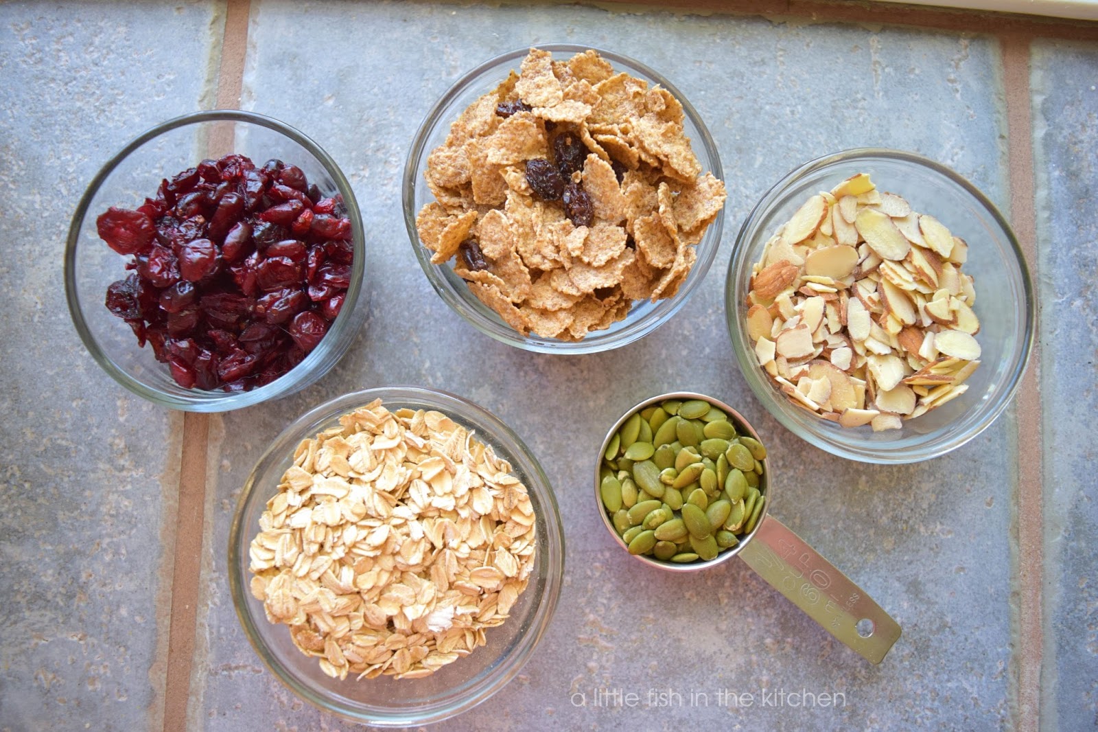 The cereal base I use for every batch is made with old-fashioned rolled oats, boxed raisin bran cereal, nuts and I alternate between unsalted sunflower seeds and pumpkin seeds. I’ve also played around with a variety of dried fruits, but I always come back to dried cranberries and apples, they’re just my favorites. I was out of dried apples at the time of this post, so they’re not pictured, but they are usually part of the mix!